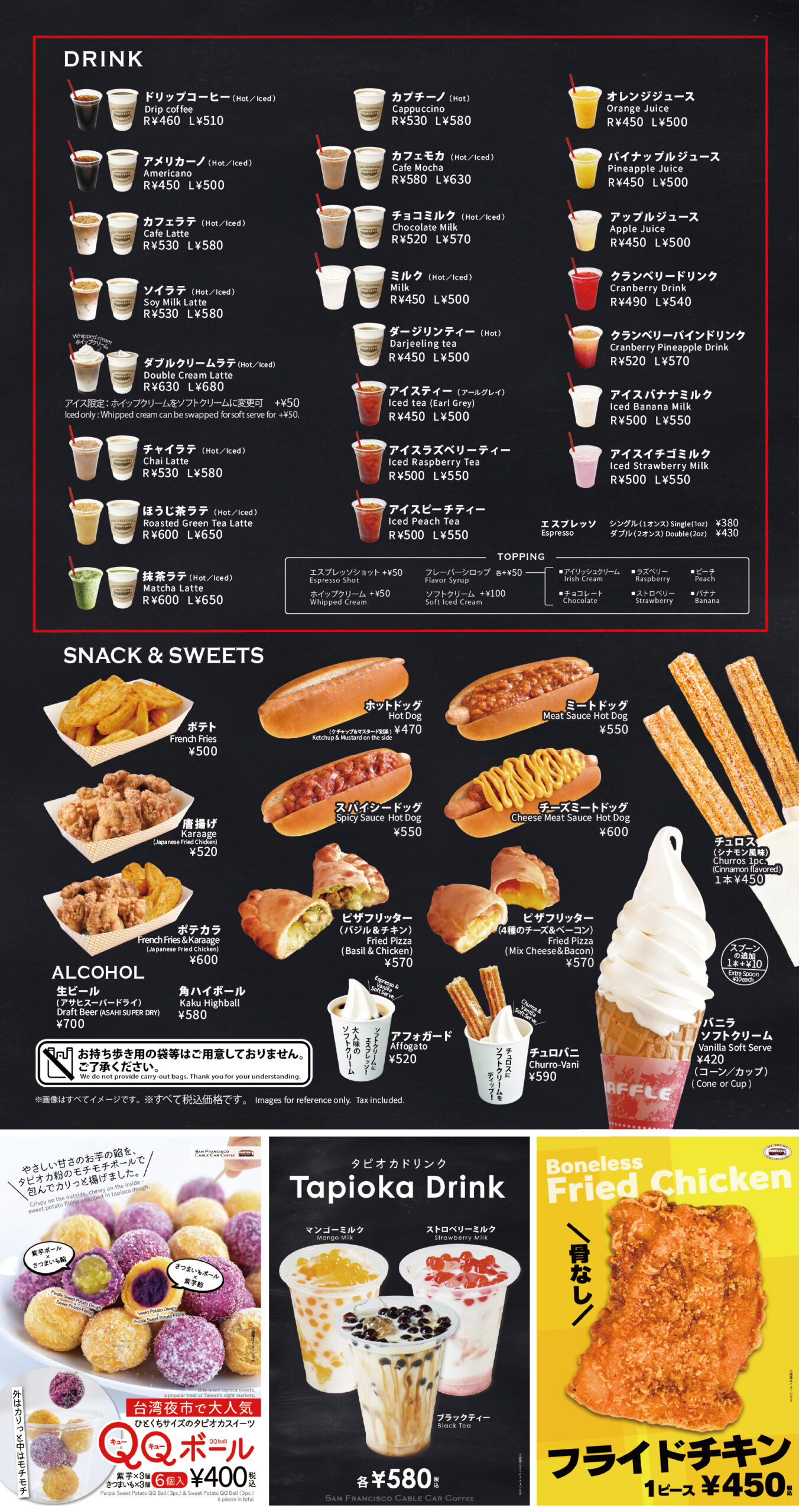 HOME > ケーブルカーコーヒー 八景島店 > ケーブルカーコーヒー 八景島店 八景島店メニュー(2025.11改訂版) 2025/10/31 ※画像をタップすると拡大表示できます。 ※2025年11月改訂版メニューです。上記の内容は予告なく変更する場合がありますのでご了承ください。※現在店頭に掲示しているメニューが最新版となります。 -ケーブルカーコーヒー 八景島店